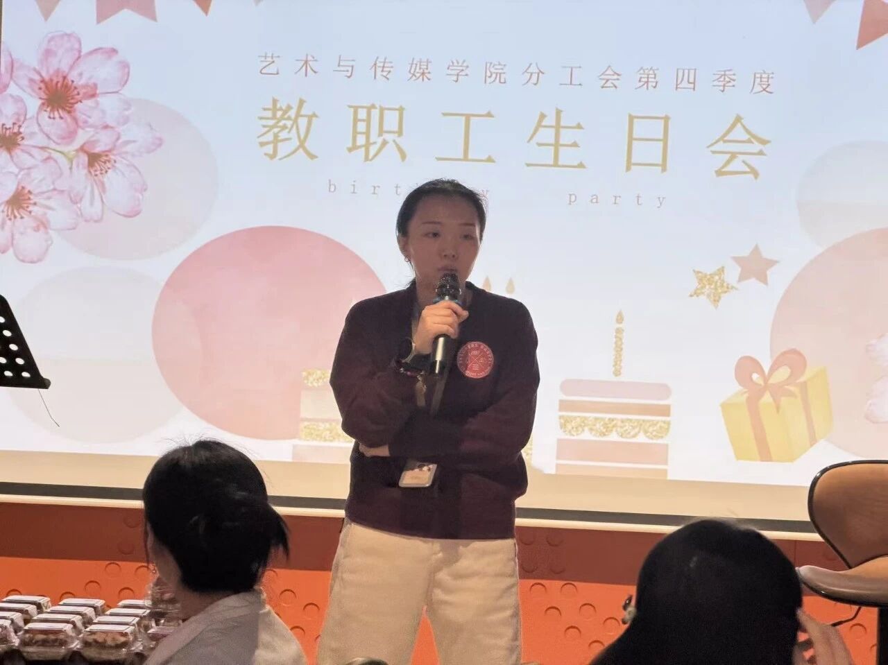 为增强学院凝聚力,营造和谐温馨的“教工之家”氛围,12月15日,艺术与传媒学院分工会在教职工活动中心举办了“拾光趣聚,生日同乐”第四季度教职工集体生日会。学院65位第四季度生日的教职工欢聚一堂,共同度过了一段充满欢笑与温情的午间时光。