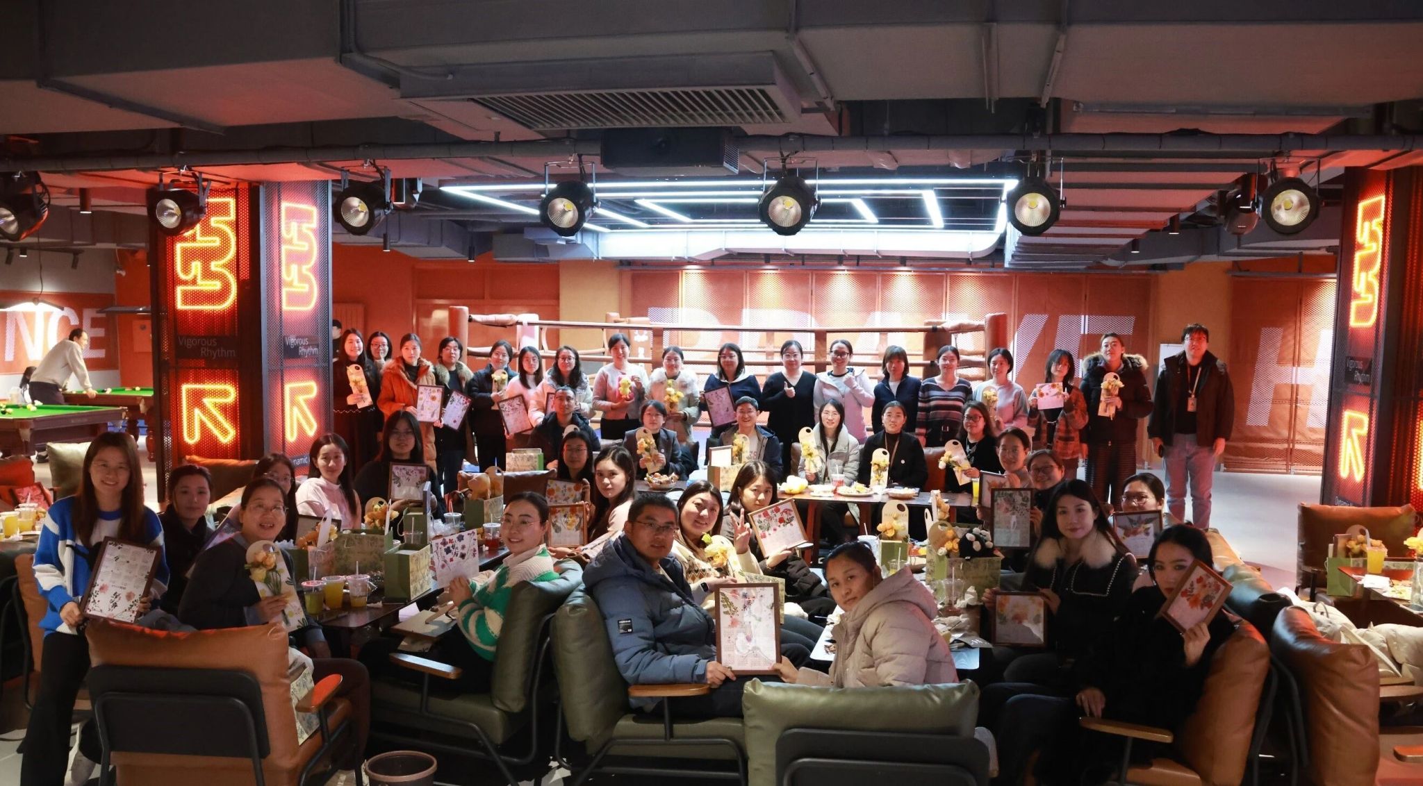 生日庆祝的欢乐氛围尚未消散,手工制作环节开启。在主持人的讲解中,老师们精心挑选干花、构思布局,打造属于自己的新年纪念。